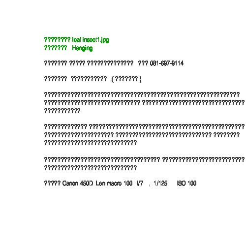 | คำอธิบาย : เป็นตั๊กแตนใบไม้ที่เลี้ยงไว้เพื่อการอนุรักษ์และเพื่อให้เด็กเห็นการเติบโตของแมลงประเภทนี้ เพราะในกรุงเทพหาดูได้ยากมากหรือแทบไม่มีเลย แมลงประเภทนี้ ถือเป็นสิ่งมหัศจรรย์ของธรรมชาติอย่างหนึ่งของไทย เพราะดูเหมือนใบไม้มาก กินใบฝรั่งหรือใบลำใยเป็นอาหาร มีการลอกคราบเพื่อเจริญเติบโตเป็นระยะ นอกจากเด็กๆจะแปลกใจกับแมลงใบไม้แล้ว ผู้ถ่ายภาพก็รู้สึกว่าเป็นแมลงที่แปลกและมหัศจรรย์จริงๆ |