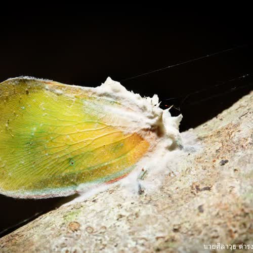 | คำอธิบาย : แมลงข้าวตอกตัวหนึ่งติดแน่นอยู่กับต้นไม้ โดยมีเชื้อราขึ้นอยู่บนตัว รากำลังทำหน้าที่ย่อยสลายแมลงตัวนี้ตามวัฏจักรในป่าธรรมชาติ |