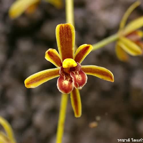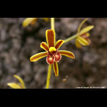 คำอธิบาย : กะเรกะร่อนด้ามข้าว (Cymbidium bicolor Lindl.) เป็นพืชในวงศ์กล้วยไม้ (Orchidaceae) ซึ่งโดยทั่วไปมี 6 กลีบ แต่ดอกนี้มีถึง 8 กลีบ ที่เด่นชัดคือมีกลีบปากถึง 2 กลีบ ซึ่งเกิดจากวามผิดปรกติของการแบ่งเซลล์และการเกิดรูปร่าง |
