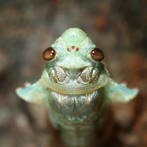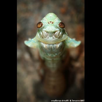 | คำอธิบาย : ผมมักเห็นภาพจักจั่นลอกคราบแบบที่ถ่ายจากด้านข้าง ภาพนี้ผมให้ความสำคัญกับเฉพาะส่วนหัวของมันเป็นหลัก เน้นให้เห็น ตารวมสองข้าง และตาเดี่ยวสามตาตรงกลางหน้าผาก เห็นปีกเล็กๆที่กำลังจะขยายใหญ่ในไม่ช้า ที่เหลือให้เบลอ ทำให้ภาพดูแปลกตาอย่างที่ไม่เคยเห็นมาก่อนครับ |