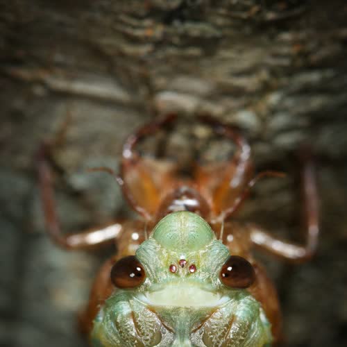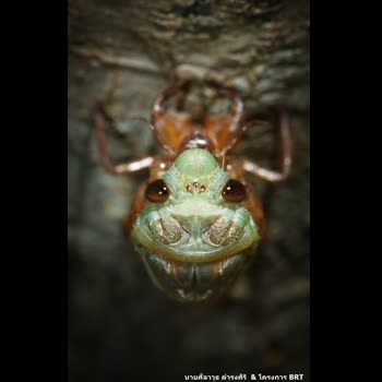| คำอธิบาย : ผมมักเห็นภาพจักจั่นลอกคราบแบบที่ถ่ายจากด้านข้าง ภาพนี้ผมถ่ายจากหลังมัน ให้คราบโดนบัง แต่ขยับมุมให้ร่างใหม่สีเขียวๆ ซ้อนกับคราบสีน้ำตาลของมัน ให้อวัยวะของทั้งสองร่างต่อกันพอดีๆ ดูสื่อถึงอวัยวะเก่าอวัยวะใหม่ดีครับ |