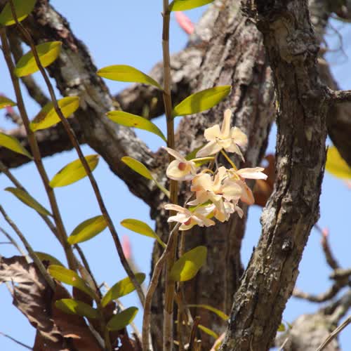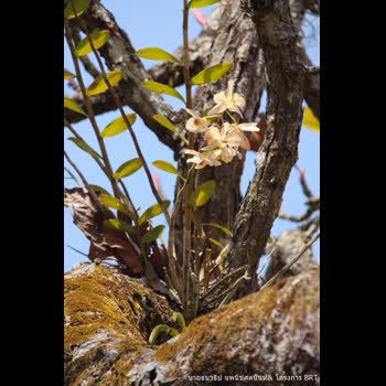 | คำอธิบาย : ภาพถ่ายดอกกล้วยไม้ป่าอย่างช้างน้าวที่มันจะออกดอกเพียงปีละครั้งเท่านั้น มันอาศัยง่ามไม้ยืนต้นสูงเป็นที่อยู่ ฝากรากของมันไว้กับต้นไม้ใหญ่เพื่อรอรับสารอาหารที่ผ่านมา และมันยังคงมีมอสเป็นเพื่อนเคียงคู่อยู่ข้างๆอีกมากมาย |