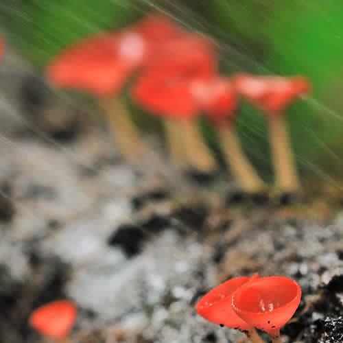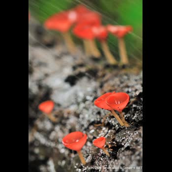 | คำอธิบาย : เห็ดแชมเปญอาศัยขึ้นอยู่ตามขอนไม้ มีลักษณะสีสันสวยงาม โดยมีเอกลักษณ์คล้ายรูปถ้วย จะพบในช่วงฤดูฝนที่มีความชุ่มชื้นของธรรมชาติ และภาพที่บันทึกได้นั้นเป็นช่วงเวลาที่สายฝนโปรยปรายลงมาอย่างงดงามสื่อถึงความประทับใจ ที่ทรงคุณค่าแห่งความสมดุลในระบบนิเวศ ที่พึ่งพาอาศัยสร้างความสมบูรณ์ให้กับธรรมชาติ |
