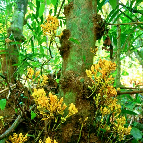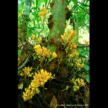 | คำอธิบาย : เขตรักษาพันธุ์สัตว์ป่าฮาลา-บาลา ณ ที่แห่งนี้คืออาณาจักรปลายสุดของสรรพสัตว์และพืชพรรณ อันน่าพิศวงของประเทศไทย หลายชนิดหายาก หลายชนิดใกล้สูญพันธุ์ และอีกหลายชนิดยังไม่เคยมีผู้ใดรู้จักมาก่อน มีต้นไม้ใหญ่อยู่ต้นหนึ่ง คือต้นโสกเหลืองหรือศรียะลา (Saraca thaipingensis) ออกดอกสีเหลืองสด เป็นช่อใหญ่ออกอยู่ตามลำต้น ช่อดอกกว้าง 15-40 ซม. ใบประดับร่วงง่าย กลีบเลี้ยง 4 กลีบ ไม่มีกลีบดอก ดอกบานไม่พร้อมกัน ดอกบานเต็มที่กว้าง 1-1.5 ซม. ออกดอกประมาณเดือนกุมภาพันธ์ถึงเดือนมีนาคม กระจายพันธุ์ในพม่าตอนใต้ คาบสมุทรมลายูและชวา ทางใต้ของประเทศไทยแถบจังหวัดภูเก็ต ตรัง ยะลา และนราธิวาส ขึ้นตามริมลำธารในป่าดิบชื้น |