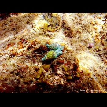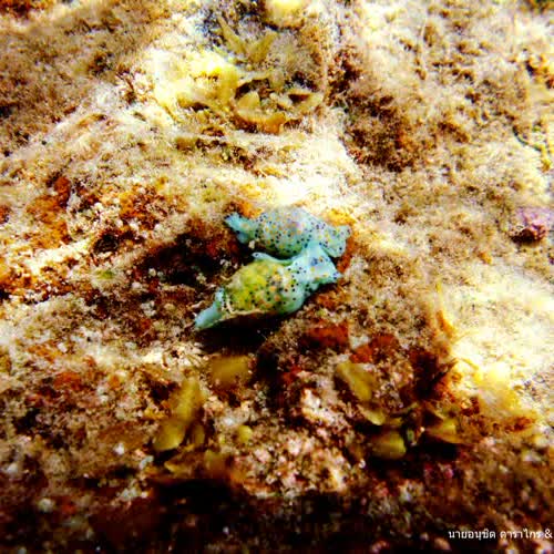 | คำอธิบาย : ภาพถ่ายใต้น้ำของหอยฝาเดียวไม่ทราบชื่อชนิดหนึ่งที่พบทั่วไปบริเวณโขดหินใต้น้ำในแนวหาดหินชายฝั่งของแหลมคอกวาง เกาะลันตาใหญ่ สีฟ้าอันสดใสสวยงามของมันดูยิ่งน่าหลงใหลมากยิ่งขึ้นเมื่อมองตัดกับสีหม่นของพื้นหินที่ถูกปกคลุมด้วยสาหร่ายและตะกอนทราย |