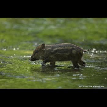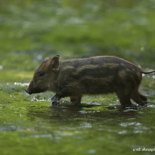 | คำอธิบาย : หมูป่าฝูงหนึ่งออกเดินหาอาหารตามลำห้วย พวกมันข้ามสายน้ำไปมาเพื่อหากินมันยาว รากไม้ ไปจนถึงปูที่หลบอยู่ใต้หินกินเป็นอาหาร จังหวะที่ลูกหมูวัยเด็กที่มีลายแตงไทยทยอยกันเดินข้ามน้ำ ทำให้เกิดเป็นภาพที่น่ารักและประทับใจทุกครั้งที่นึกถึงพวกมัน |