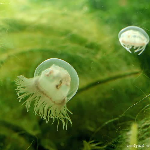 | คำอธิบาย : แมงกะพรุนน้ำจืด พบได้ในแหล่งน้ำนิ่งริมแม่น้ำโขง เช่น ร่องน้ำ บุ่ง เวลาว่ายน้ำจะเห็นการพัดโบกของ umbrella และ tentacle เป็นลีลาที่พลิ้วไหวสวยงาม |