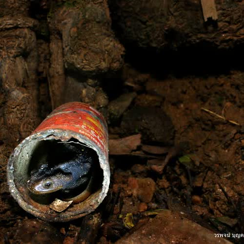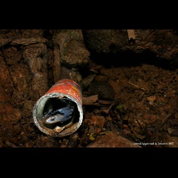 | คำอธิบาย : กระท่าง อาศัยกระป๋องที่ถูกทิ้งอย่างมักง่ายเป็นที่หลบภัย |
