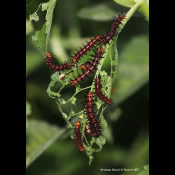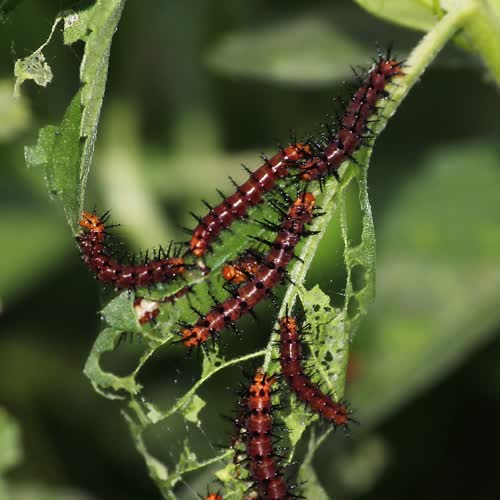 | คำอธิบาย : หนอนผีเสื้อกำลังกันกินใบไม้เพื่อกักเก็บเป็นพลังงานในระยะดักแด้ ในขณะที่อีกตัวหนึ่ง (ตัวบนซ้ายมือ) กำลังย้ายไปหาใบใหม่บริเวณใกล้เคียงเพื่อกินใบต่อไป |