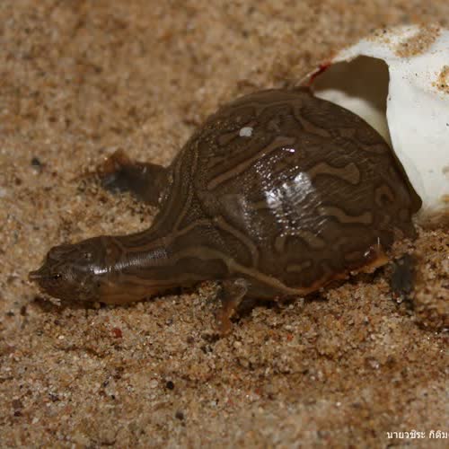 | คำอธิบาย : ตะพาบม่าน มีชื่อเรียกตามท้องถิ่นหลายชื่อคือ กริวลาย กราวด่าง ม่อมลาย มั่มลาย มีชื่อวิทยาศาสตร์คือ ลาย Chitra chitra Nutphand, 1986 เป็น 1 ใน 6 ชนิดของพันธุ์ตะพาบพื้นเมืองของไทย เป็นตะพาบพันธุ์ที่ใหญ่ที่สุดในโลก มีน้ำหนักมากกว่า 200 กิโลกรัม ลักษณะที่สำคัญคือ กระดองหลังแบนและเรียบ สีของลำตัวเปลี่ยนได้ตามสภาพแวดล้อม ตั้งแต่สีน้ำตาลเหลืองจนถึงน้ำตาลออกม่วง มีลวดลายสีอ่อนกว่าสีของกระดองหลัง มีลายคล้ายลายพรางซึ่งเป็นลักษณะเฉพาะของแต่ละตัวอยู่บนกระดองหลัง และมีลายรูปเจดีย์บริเวณไหล่และคอด้านบน กระดองท้องสีขาวอมชมพู หัวมีขนาดเล็กและยาว คอยาว ในประเทศไทยพบตะพาบม่านลายที่ลุ่มน้ำแม่กลองและแม่น้ำปิง ปัจจุบันประชากรของตะพาบม่านลายลดลงมากเนื่องจากถูกจับเพื่อเป็นอาหารและขายเพื่อเป็นสัตว์เลี้ยง ถิ่นที่อยู่อาศัยถูกบุกรุกเนื่องจากการขยายตัวของชุมชน และการรุกของชุมชนเข้าไปในถิ่นที่อยู่อาศัย ด้วยเหตุผลดังกล่าวทำให้ตะพาบม่านลายถูกจัดให้อยู่ในสถานภาพใกล้สูญพันธุ์อย่างยิ่ง (Critically endangered species, CR)กรมประมง ประสบความสำเร็จในการเพาะพันธุ์ตะพาบม่านลายครั้งแรกของโลก ที่ศูนย์วิจัยและพัฒนาประมงน้ำจืดกาญจนบุรี ตั้งแต่ พ.ศ. 2545ภาพลูกตะพาบม่านลายกำลังก้าวเดินออกจากไข่เหนือหลุมฟักที่แม่วางไข่ทิ้งไว้ประมาณ 2 เดือนที่แล้ว เพื่อหาแหล่งน้ำในการดำรงชีวิตต่อไป |