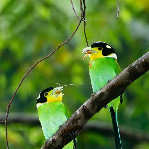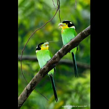 | คำอธิบาย : ครอบครัวนกพญาปากกว้างหางยาว ต่างหาอาหารมารอป้อนลูกน้อย โดยเกาะกิ่งไม้ใกล้รัง เพื่อรอจังหวะไม่ให้อยู่ในสายตาของศัตรูก่อนบินเข้ารัง |