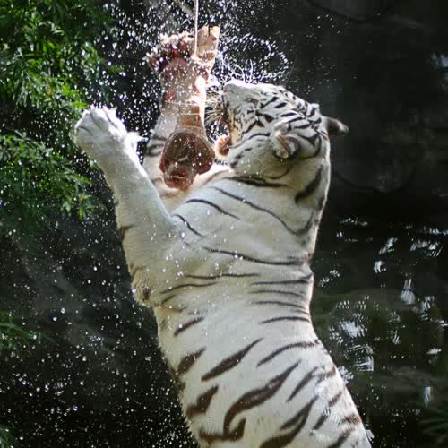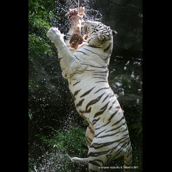 | คำอธิบาย : เสือโคร่งเผือก กระโดดคว้าอาหาร มันถูกฝึกให้ได้ออกกำลังกายอย่างสม่ำเสมอ |