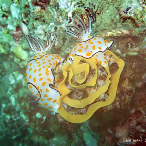 | คำอธิบาย : ทากเปลือยเป็นหอยชนิดหนึ่ง เป็นสิ่งมีชีวิตที่สร้างสีสันให้แก่ท้องทะเล และสร้างความตื้นเต้นให้แก่นักดำน้ำมาก มีหลายชนิดหลากสี และพฤติกรรมของทากทะเลในขณะวางไข่เป็นภาพที่หาชมได้ยาก น้อยคนนักที่จะได้พบเห็น |