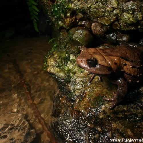 | คำอธิบาย : อึ่งกรายข้างแถบ เป็นอึ่งกรายขนาดใหญ่ที่พบเห็นตัวได้ค่อนข้างยาก มักหลบซ่อนตัวอยู่ใต้โพรงหินใหญ่ของลำธารน้ำไหล ยกเว้นช่วงฤดูผสมพันธุ์จะออกมาร้องเรียกตัวเมียด้วยเสียงที่ดังกังวานไปไกล |