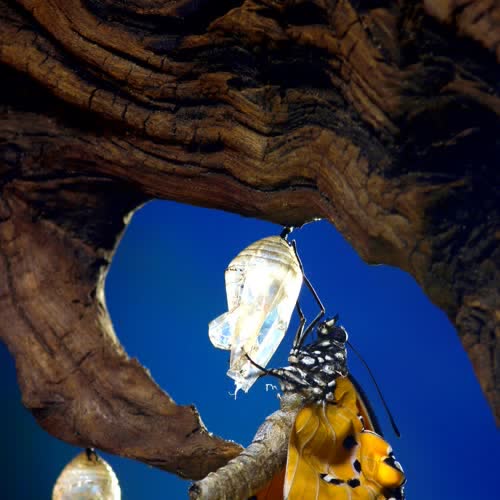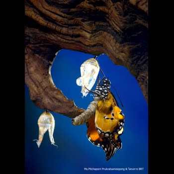 | คำอธิบาย : ผีเสื้อชนิดนี้ น่าจะเป็นชนิดพันธุ์ชื่อ หนอนใบลัก เป็นเรื่องมหัศจรรย์ที่เราได้เห็นวินาทีที่มันออกจากเปลือกดักแด้ เพราะเราได้เฝ้าดูมันตั้งแต่เห็นดักแด้ จึงคอยเวียนมาดูมันอยู่ตลอด จึงเห็นช่วงเวลาที่มันใกล้ออกมาดูโลก เปลือกของมัน จะมีสีเข้มขึ้นในเวลาไม่นาน พอเราตั้งกล้องรอมันซักพัก จึงได้เห็นมันโผล่ออกมา เราจึงเป็นคนแรกที่ได้ทักทายมัน ในร่างใหม่ของมัน ภาพที่เห็นนี้เป็นช่วงเวลาที่มันห้อยปีกลง เพื่อให้เลือดไปเลี้ยงให้ปีกแข็งแรงพอที่จะบินออกหากินต่อไป |