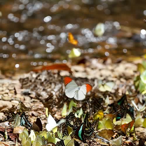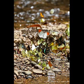 | คำอธิบาย : เมื่ออากาศร้อนจนแหล่งน้ำเริ่มแห้งเหือด บรรดาเหล่าผีเสื้อนานาชนิด จะพากันมากินเกลือตามดินโป่งหรือแหล่งน้ำแฉะๆมากมาย |