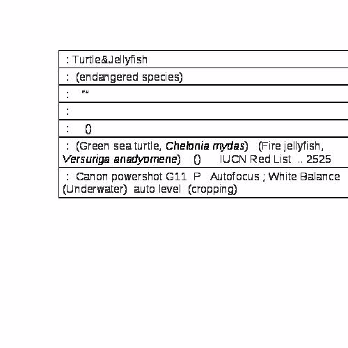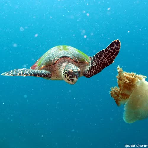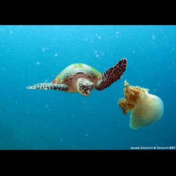 | คำอธิบาย : เต่าตนุ (Green sea turtle, Chelonia mydas) กำลังว่ายเข้าหาอาหารคือ แมงกะพรุนไฟ (Fire jellyfish, Versuriga anadyomene) ในขณะที่แมงกะพรุนพยายามหนีสุดชีวิต ภาพนี้แสดงให้เห็นชัดเจนว่า เต่าทะเลกินแมงกะพรุนเป็นอาหาร (ผู้ถ่ายตัดสินใจถ่ายบันทึกเป็นภาพวิดีโอไว้เนื่องจากเป็นภาพที่พบเห็นได้ยากมาก) สีและเนื้อของแมงกะพรุนคล้ายกับถุงพลาสติก เมื่อเราทิ้งถุงพลาสติกลงไปในทะเลอาจทำให้เต่าทะเลเข้าใจผิดคิดว่าเป็นแมงกะพรุนและกินถุงพลาสติกเข้าไป แต่กระเพาะอาหารของเต่าทะเลไม่มีน้ำย่อยที่สามารถย่อยถุงพลาสติกได้จึงอุดตันในทางเดินอาหารจนทำให้เต่าทะเลเสียชีวิตในที่สุดและผลที่ตามมาคือเต่าทะเลในธรรมชาติก็ยิ่งลดจำนวนลงไปอีก ภาพนี้สามารถใช้รณรงค์สร้างจิตสำนึกให้ประชาชนไม่ทิ้งขยะลงในทะเล ปัจจุบันเต่าตนุจัดอยู่ในบัญชีรายชื่อสัตว์ใกล้สูญพันธุ์ของ IUCN Red List ตั้งแต่ปี พ.ศ. 2525 |