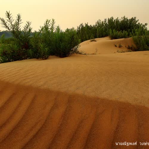 | คำอธิบาย : ระบบนิเวศชายหาด ในช่วงที่ระดับน้ำในแม่น้ำโขงสูงขึ้น จะมีการพัดพาทรายจำนวนมากมากองรวมกัน เมื่อน้ำแห้ง ลมจะเป็นตัวรังสรรค์ริ้วทรายที่สวยงาม พืชที่ขึ้นอยู่บริเวณนี้มีการปรับตัวให้ดำรงชีวิตใช้น้ำเป็นเวลานานและสามารถดำรงชีวิตบนผืนทรายที่แห้งแล้งนี้ได้ |