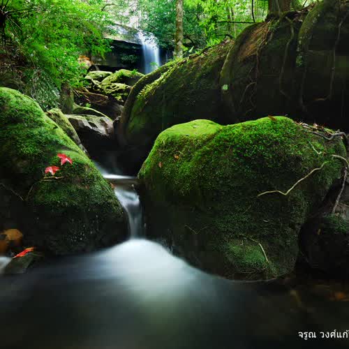 | คำอธิบาย : ป่าอยู่ได้เพราะน้ำ น้ำมีได้เพราะป่า ต่างอาศรัยซึ่งกันและกัน จากต้นกำเนิดธรรมชาติเป็นสายน้ำให้ความชุ่มชื้นกับป่า และป่านั้นผลิตอากาศที่บริสุทธิ์ น้ำเปรียบดั่งสายเลือดหล่อเลี้ยงธรรมชาติต่อไป |