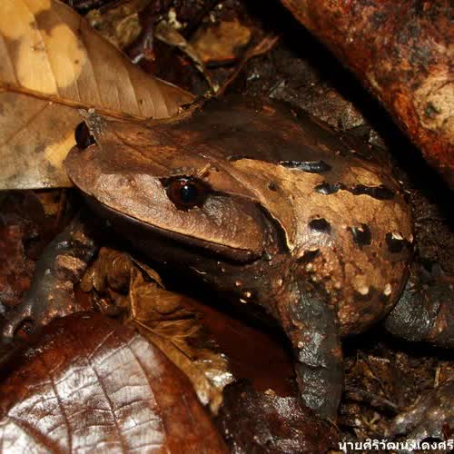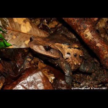 | คำอธิบาย : Brachytarsophrys carinensis อึ่งกรายข้างแถบ เป็นอึ่งกรายขนาดใหญ่ สีสันกลมกลืนกับใบไม้ ทำให้เห็นตัวได้ยาก |