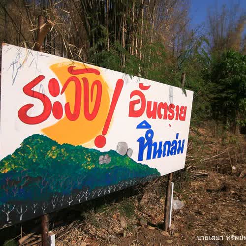 | คำอธิบาย : เชิงเขาแห่งนี้ มีป้ายขนาดใหญ่ปักอยู่ จากข้อความบนป้าย แสดงว่าบริเวณนี้ไม่ควรเข้าใกล้ เนื่องจากพื้นที่ส่วนใหญ่เป็นป่าไผ่และมีก้อนหินขนาดใหญ่เป็น จำนวนมาก หากฝนตก อาจมีน้ำป่าไหลหลาก อันตรายถึงชีวิต |
