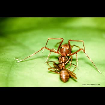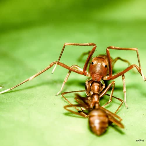 | คำอธิบาย : แมงมุมกระโดดที่มีรูปร่างคล้ายมดแดงกำลังคาบซากมดแดง และในขณะเดียวกันก็หนีมดแดงอีกตัวที่กำลังตามหามดแดงที่หายไป (มันเป็นอย่างนั้นจริงๆ) ทำให้แมงมุมตัวนี้ไม่สามารถกินมดแดงอย่างสบายใจ เพราะต้องหนีทั้งมดและหนีกล้อง ผมรอจังหวะที่แมงมุมจะหยุดนึ่งอยู่พักใหญ่กว่าจะได้ภาพนี้ |