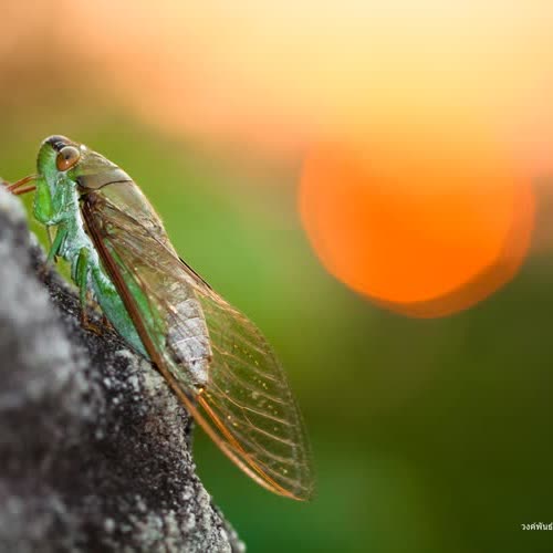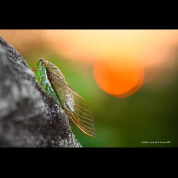 | คำอธิบาย : ช่วงปลายหน้าหนาวของปี จักจั่นตัวนี้กำลังเดินขึ้นมาอาบแสงแรกของเช้าวันใหม่ โดยที่ผมรอให้ดวงอาทิตย์ขึ้นมาอยู่ในตำแหน่งที่เหมาะสม จากนั้นจัดองค์ประกอบเล็กน้อย เพื่อให้เห็นแสงสีส้มอ่อนๆของดวงอาทิตย์และสีเขียวของผืนป่าโดยรอบ |
