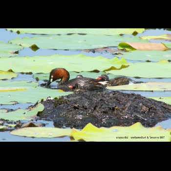 | คำอธิบาย : ภาพนกเป็ดผีเล็ก (Little Grebe) กำลังพาบรรดาลูกๆ ของมันฝึกฝนการหาอาหารเพื่อเลี้ยงชีพของมันเอง ในขณะที่ลูกของมันยังไม่แข็งแรงดีพวกมันจะว่ายน้ำอยู่ไม่ไกลรังของมันมากนัก และอาศัยหาจับสัตว์น้ำตัวเล็กๆ ที่ว่ายผ่านมาแถวนั้นกินเป็นอาหาร มันเป็นแบบฝึกหัดที่สำคัญบทหนึ่งของบรรดาลูกนกที่ต้องเรียนรู้ไว้เพื่อใช้ประทังชีวิตของพวกมันต่อไป ผมเฝ้าถ่ายภาพนกเป็ดผีเล็กและลูกน้อยของมันในยามเช้าของวันหนึ่งที่อากาศสดใสในบึงบอระเพ็ด ผมเห็นมันพาลูกน้อยว่ายน้ำไปมาเพื่อหาจับปลาตัวเล็กๆกินเป็นอาหาร มันจะพาลูกน้อยไปไล่จับปลาบริเวณรอบๆรังของมัน ผมเฝ้าแพนกล้องตามมันตลอดเวลาด้วยสมาธิที่ตั้งมั่นและรอจังหวะลั่นชัตเตอร์เวลาที่มันกำลังจับปลาพอดี และแล้วมันก็จับปลาได้บริเวณที่ใกล้กับรังของมันพอดี จึงทำให้ภาพถ่ายใบนี้มีเรื่องราวที่ร้อยเรียงองค์ประกอบให้สมบูรณ์ยิ่งขึ้นอีก |