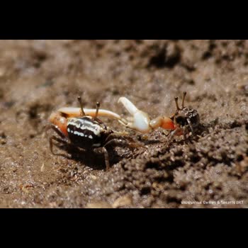 | คำอธิบาย : ปูก้ามดาบ พบในบริเวณป่าชายเลน มีความสำคัญต่อระบบนิเวศชายฝั่งและท้องทะเล เพราะปูเป็นสัตว์ที่เก็บสารอินทรีย์ขนาดเล็กบนทรายกินเป็นอาหาร ปูมีก้ามขนาดใหญ่เพื่อใช้โบกพัดแสดงความเป็นเจ้าของอาณาเขต ปูก้ามดาบจะหากินไม่ไกลรูของมัน เมื่อมีปูตัวอื่นเข้ามาในอาณาเขตจึงมีการอวดก้ามเพื่อประลองกำลังกัน |