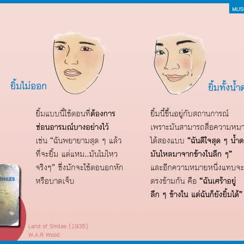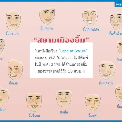 | คำอธิบาย : เคยรู้หรือไม่ว่าคนไทยมีรูปแบบรอยยิ้มมากถึง 13 แบบ แต่ละแบบนั้นมีความหมายเฉพาะที่แสดงอารมณ์ความรู้สึกแตกต่างกัน |