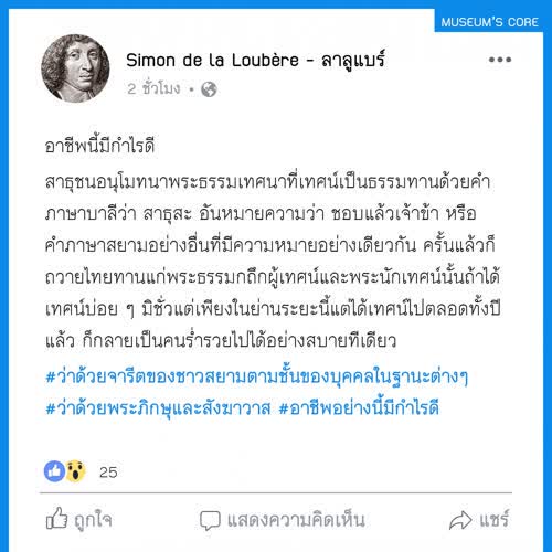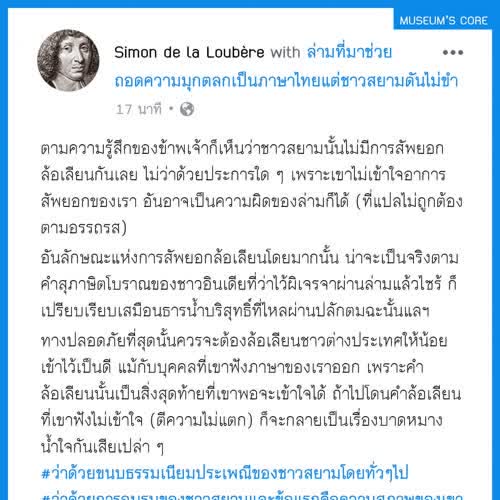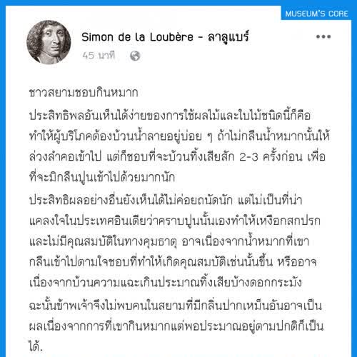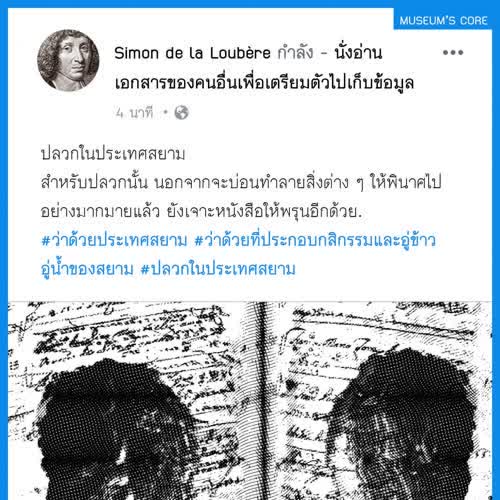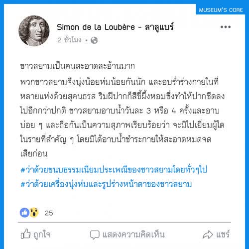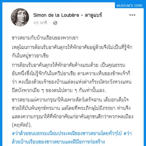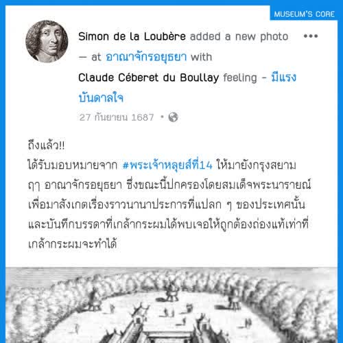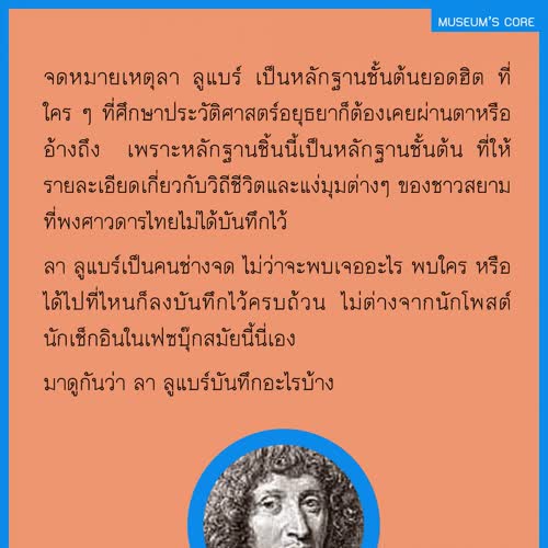 | คำสำคัญ : บ้านเมือง, อยุธยา, พิพิธภัณฑ์, จดหมายเหตุ, ชาวสยาม, วัฒนธรรม, กรุงศรีอยุธยา, สังคมไทย, Facebook, เฟสบุ๊ค, วิถีชีวิต, ลาลูแบร์, สมัยสมเด็จพระนารายณ์, บันทึก, ชาวฝรั่งในสยาม, มิวเซียมสยาม, ฝรั่งเศส-สยาม, Infographic, ประวัติศาสตร์, หลักฐานชั้นต้น |