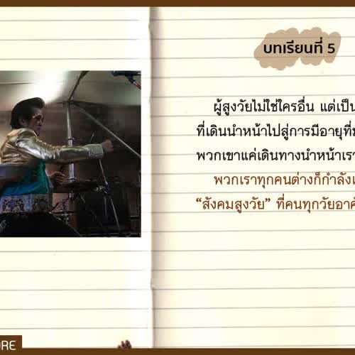 | คำอธิบาย : ปัจจุบันทั่วโลกมีลักษณะโครงสร้างสังคมและประชากรที่เปลี่ยนไปเป็นสังคมอายุยืนซึ่งมีประชากรส่วนใหญ่เป็นผู้สูงอายุ ภายใต้โครงสร้างสังคมอายุยืนประชากรกลุ่มเด็กมีสัดส่วนน้อยอันเป็นผลสืบเนื่องมาจากอัตราการเกิดที่ลดลง จากสถิติล่าสุดในปีพ.ศ. 2560 พบว่ามีคนไทยที่อายุยืนกว่า 100 ปี มากถึง 9,041 คน ดังนั้นสังคมไทยกำลังก้าวเข้าสู่สังคมอายุยืนอย่างสมบูรณ์ |