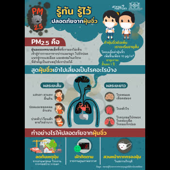| คำอธิบาย : PM2.5 คือ ฝุ่นละอองขนาดเล็กจิ๋วที่เรามองไม่เห็น เข้าสู่ร่างกายเราทางปากและจมูก ไปยังปอด แพร่ไปสู่กระแสเลือด และสะสมในอวัยวะที่สำคัญเป็นสาเหตุให้เราป่วยได้ |