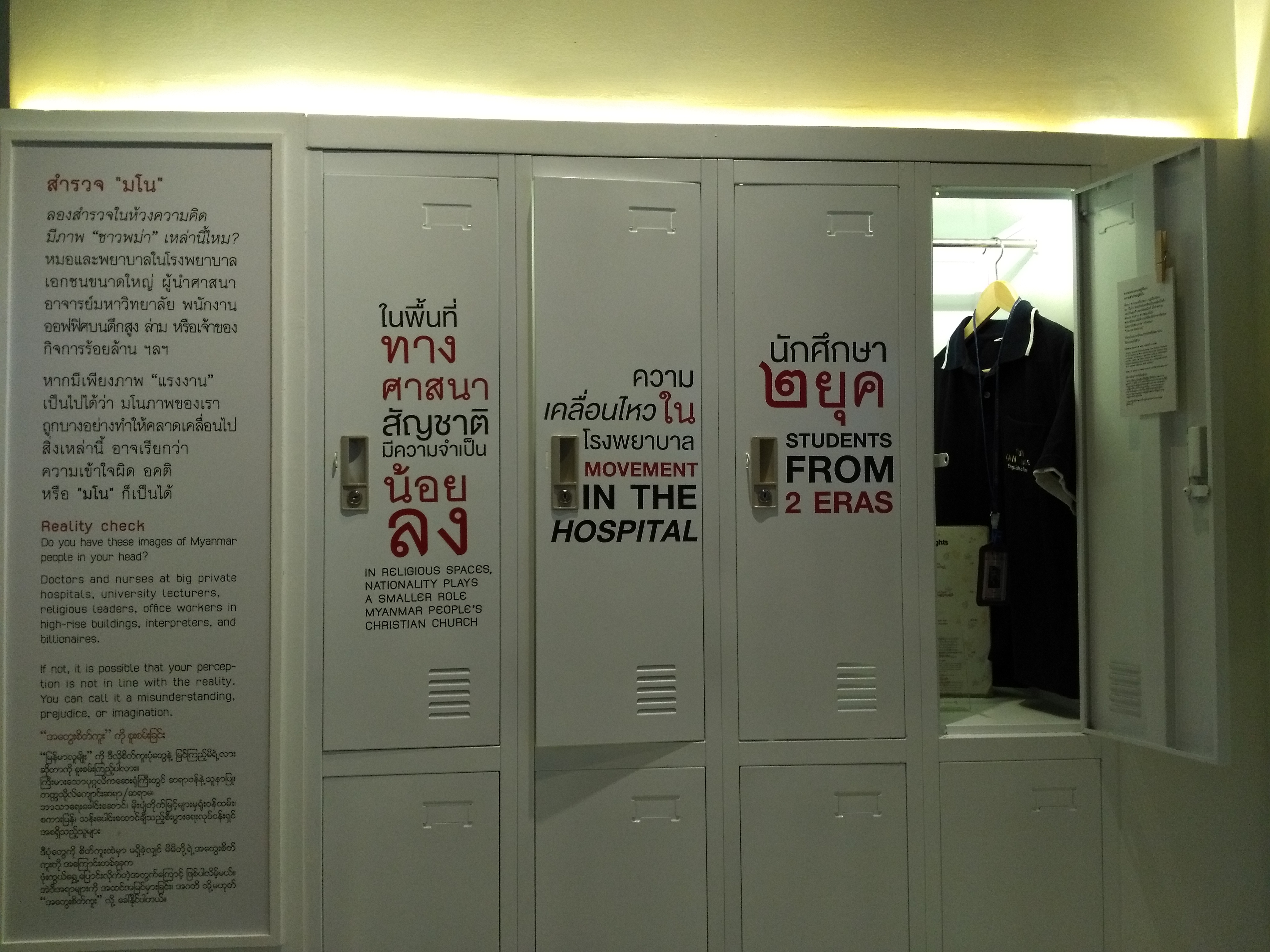| คำอธิบาย : นิทรรศการหมุนเวียน: พม่าระยะประชิด ตีแผ่เรื่องราวชีวิตของคนพม่าในประเทศไทย เพื่อให้คนไทยได้รู้จัก เพื่อนบ้าน ในมุมมองใหม่ๆ และเปิดใจยอมรับความหลากหลายในสังคม มีความเข้าใจถึง ที่มา ที่เป็นอยู่ ที่ไปของคนพม่า โดยบอกเล่าถึงจุดเริ่มต้นและเหตุผลของการออกเดินทาง ตลอดจนนำเสนอกลยุทธ์การดำเนินชีวิตในประเทศไทย รวมถึงสะท้อนประสบการณ์การทำงาน การวางแผนชีวิตในอนาคตและแง่มุมทางวัฒนธรรมที่ทั้งสองชาติมีรากฐานร่วมกันที่ทำให้เราเข้าใจตัวเองมากยิ่งขึ้น นิทรรศการ พม่าระยะประชิด จัดแสดง ณ มิวเซียมสยาม ระหว่างวันที่ 15 มีนาคม - 31 กรกฎาคม 2559 |