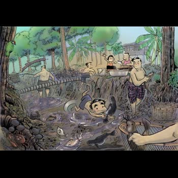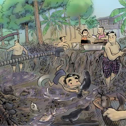 | คำอธิบาย : ปลายฤดูร้อน หลังเก็บไม้ผลในสวนหมดแล้ว และท้องร่องเริ่มตื้นเขินด้วยใบไม้ในสวนร่วงหล่นลงไปทับถม ก็จะได้เวลาลอกท้องร่องของเหล่าชาวสวนการนี้ได้ประโยชน์หลายอย่างทีเดียว อย่างแรก ก็ได้ลำคลองที่ลึกขึ้นไว้เก็บน้ำ ได้เอากากตะกอนใบไม้ที่ทับถมหมักบ่มอยู่ก้นร่อง ขึ้นมาเป็นปุ๋ยชั้นดีให้ต้นไม้ และยังได้ปลาตัวโตๆ เป็นผลพลอยได้มาทำกับข้าวเริ่มต้นเราก็จะมาทำเขื่อนที่หัวร่องและปลายร่องด้วยลำหมากและเอาดินถมคันเขื่อนไว้ จากนั้นก็จะยืมที่สูบน้ำของสวนอื่นที่มี สูบน้ำออกจนหมดเหล่าพี่ๆ ลูกของป้า บางคนก็ลงไปโกยขี้เลนสาดขึ้นมาทับถมไว้ที่อกร่อง ส่วนเหล่าตัวเล็กตัวน้อยก็ลงไปจับปลาที่แถกโคลนอยู่ไปมา ขณะที่เหล่าสาวๆ แม่ๆ ป้าๆ ก็ยกเขียงควงมีด ทำปลากันอยู่ที่ริมตลิ่งนั่นเลยจบงานนี้เราได้เมนูปลากินไปเป็นอาทิตย์ๆ ทั้งแดดเดียว ทั้งต้มยำ แล้วแต่จะสรรหาเหล่าเด็กๆ อย่างเราน่ะไม่ต้องการอะไรมาก แค่ได้โอกาสลงเอาตัวไปคลุกเล่นกับขี้เลนขี้โคลนที่ก้นท้องร่องมากกว่าไล่จับปลาด้วยซ้ำ แค่นี้ก็สนุกลืมตายแล้ว |