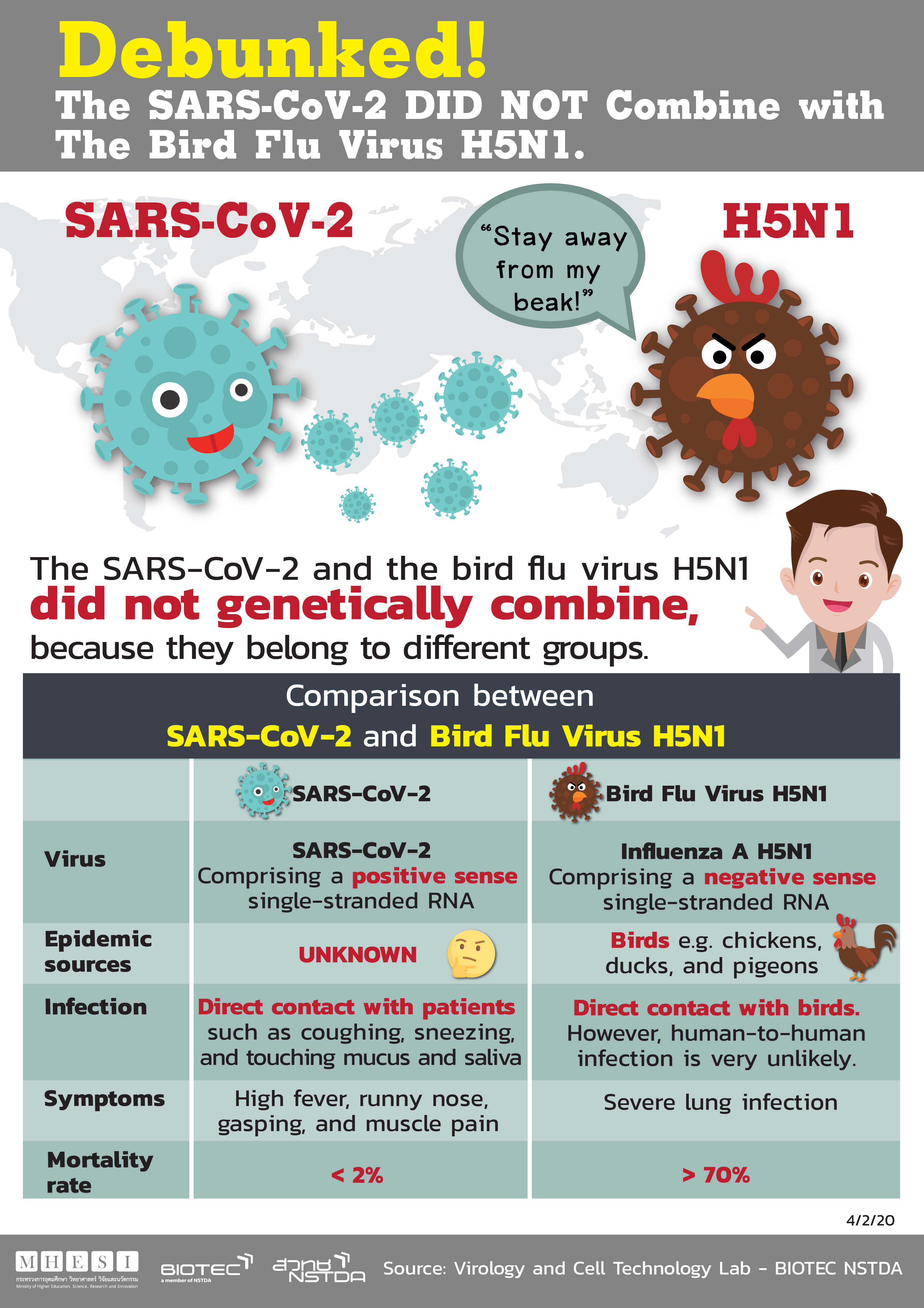| คำอธิบาย : The SARS-CoV-2 DID NOT Combine with The Bird Flu Virus H5N1. did not genetically combine, because they belong to different groups. |