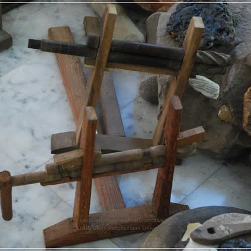 | คำอธิบาย : เครื่องอิ้วฝ้าย ในพิพิธภัณฑ์พระโพธิญาณเถร วัดหนองป่าพง อำเภอวารินชำราบ จังหวัดอุบลราชธานี เป็นเครื่องมือสำหรับแยกเปลือกและเมล็ดฝ้ายออกจากปุยฝ้าย การอิ้วฝ้ายจะนำปุยฝ้ายค่อย ๆ ป้อนเข้าไประหว่างท่อนไม้ทั้งสอง ระหว่างนั้นก็หมุนฟันเฟืองไปด้วย เพื่อให้ท่อนไม้หมุนและแยกเปลือกและเมล็ดฝ้ายออกคนละด้าน |