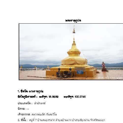 | คำสำคัญ : คณะทำงานข้อมูลท้องถิ่น PULINET, วัดในจังหวัดพะเยา, พระธาตุภูปอ |