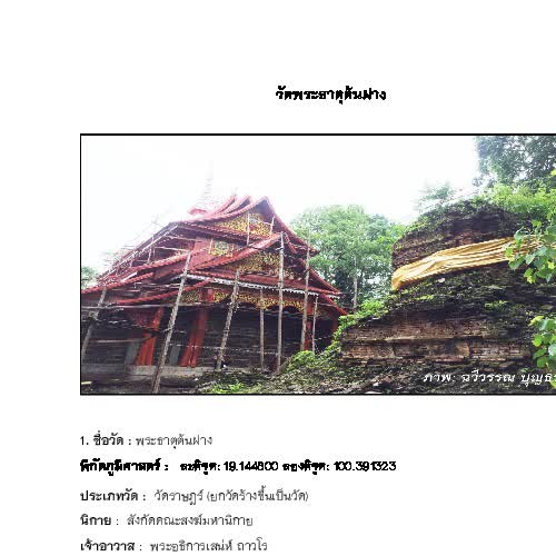 | คำสำคัญ : คณะทำงานข้อมูลท้องถิ่น PULINET, วัดในจังหวัดพะเยา, วัดพระธาตุต้นฝาง |