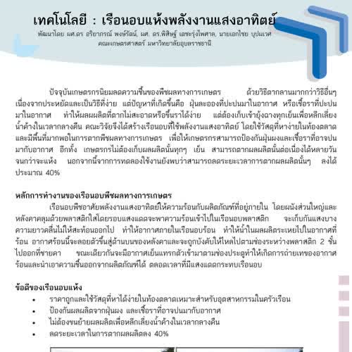 | ชื่อเรื่อง : เทคโนโลยี : เรือนอบแห้งพลังงานแสงอาทิตย์ |