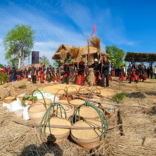 คำอธิบาย : วางข้าวเปลือกที่นำมาจากขบวนแห่ในงานหวัวบุญเบิกฟ้า ปี พ.ศ. 2561 |