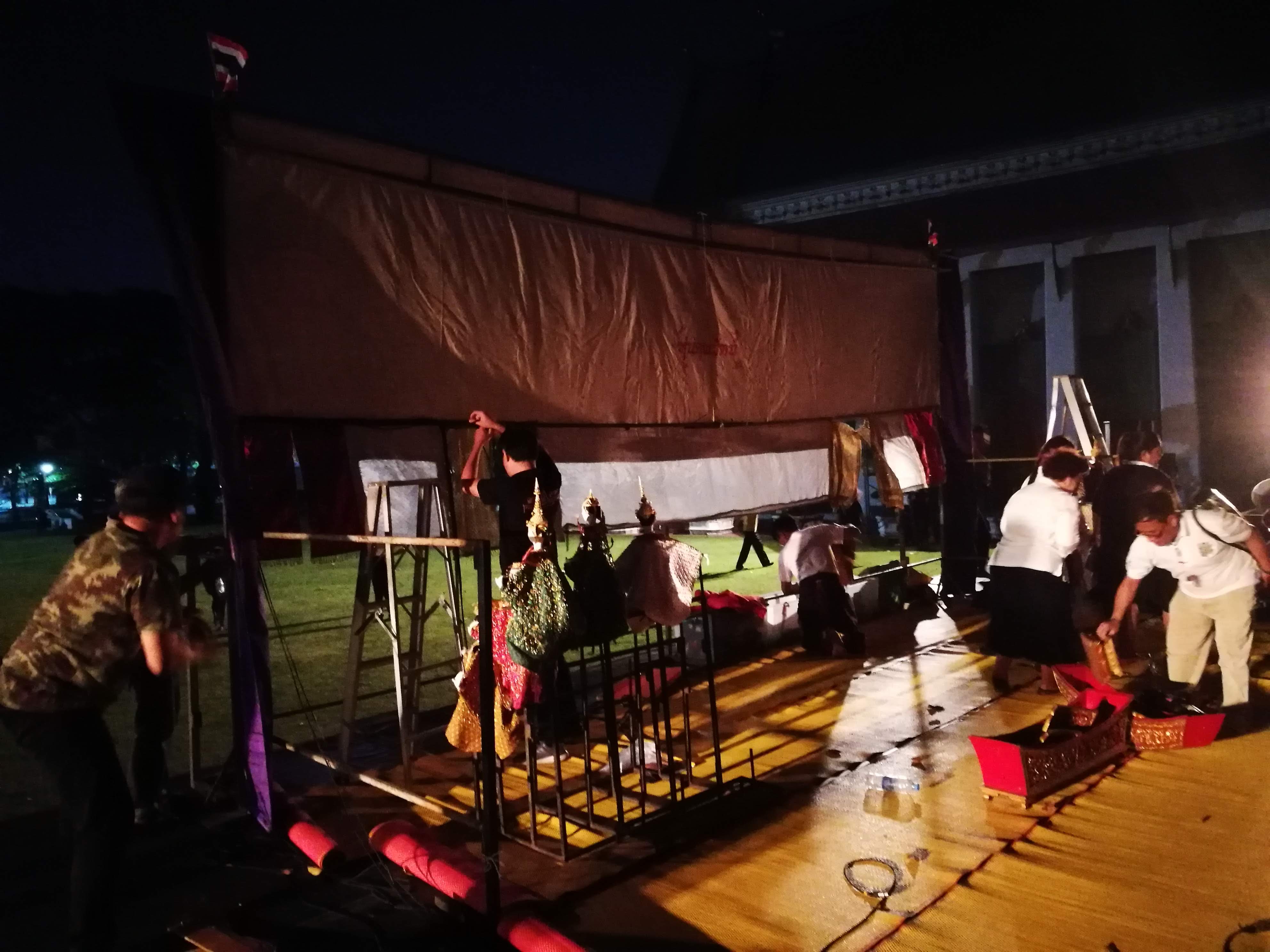 | คำอธิบาย : เก็บโรงเชิดหุ่น หลังจบการแสดงหุ่นกระบอก ของคณะหุ่นครูรัตน์ ในโครงการดนตรีสำหรับประชาชน ที่จัด ณ สังคีตศาลา เวทีกลางแจ้ง พิพิธภัณฑสถานแห่งชาติ พระนคร เมื่อวันที่ 16 ก.พ. 2562 |