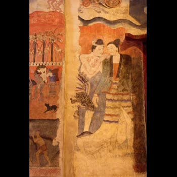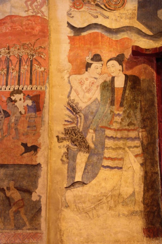 | คำสำคัญ : ภาพวาดกระซิบรักบรรลือโลก, จ. น่าน, ภาพวาดฝาผนัง, วัดภูมินทร์, จิตรกรรมฝาผนัง |