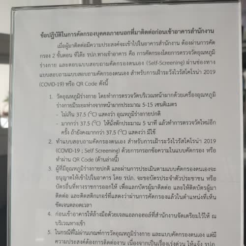 คำอธิบาย : เพื่อลดความแออัดและป้องกันการแพร่ระบาดเชื้อไวรัส COVID-19 ขอความร่วมมือทุกท่านปฏิบัติตามข้อปฏิบัติในการคัดกรองบุคคลภายนอกที่มาติดต่อก่อนเข้าอาคารสำนักงาน |
