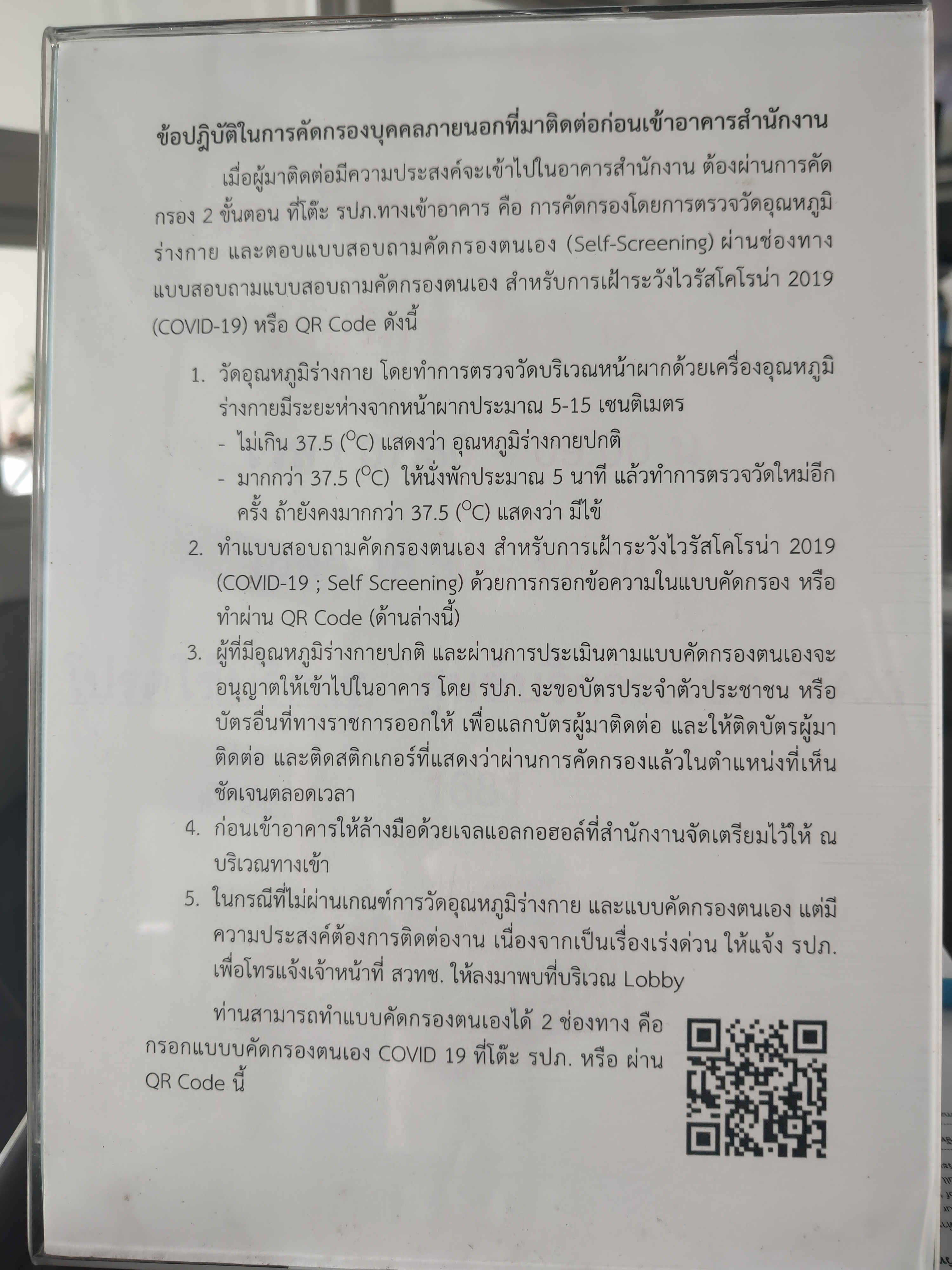 (2563). "ข้อปฏิบัติในการคัดกรองบุคคลภายนอกที่มาติดต่อก่อนเข้าอาคารสำนักงาน".