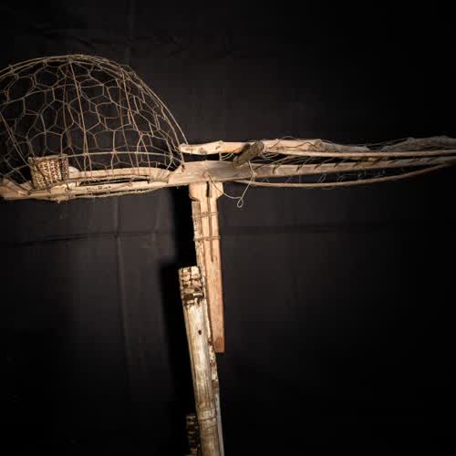 | คำอธิบาย : ขิง ทำจากไม้ประกอบด้วยตาข่ายเหล็กด้านบนประกอบด้วย กรงนกที่ทำด้วยตาข่ายโลหะประกอบไม้ ส่วนอีกด้านเป็นส่วนที่ใช้ดักจับนำ จะเป็นไม้ตะแกรง 2 ชิ้น สามารถอ้าออกจากกันได้ ด้านล่างเป็นตะแกรงเหล็ก ส่วนด้านบนเป็นตะแกรงที่ใช้ตาข่ายเชือกมาประกอบกันเหล็กแล้วนำมาประกอบกับลำไม้ไผ่ยาว ด้านล่างกรงมีตะขอเพื่อใช้เกี่ยวกับกิ่งไม้ ใช้สำหรับการตั้ง (ต่อ) นกเขาเพื่อจับนกเขาป่า โดยการนำนกเขาต่อใส่ขิง หรือกรงด้านบน และเอาไปล่อต่อนกเขาตัวใหม่ |