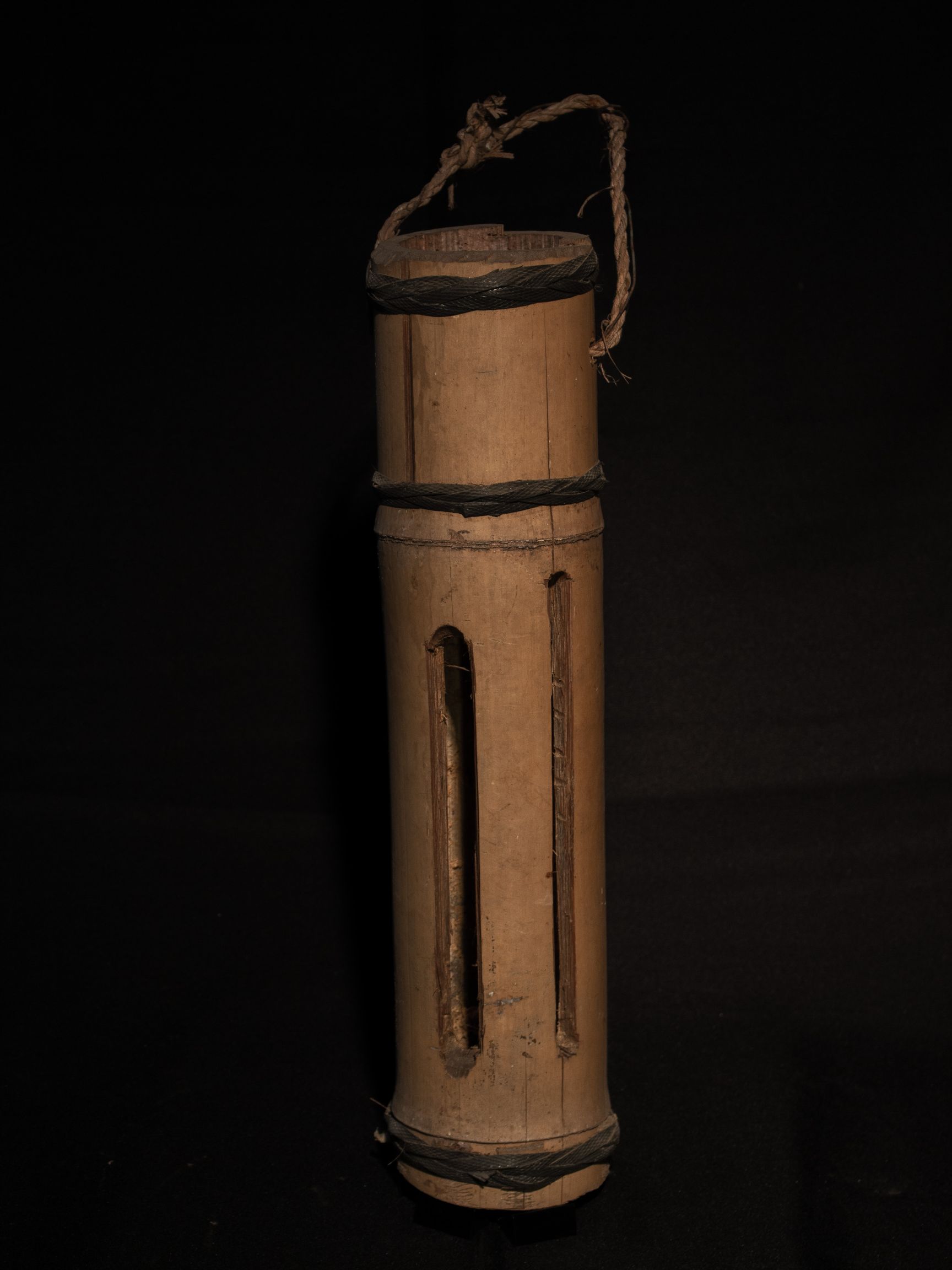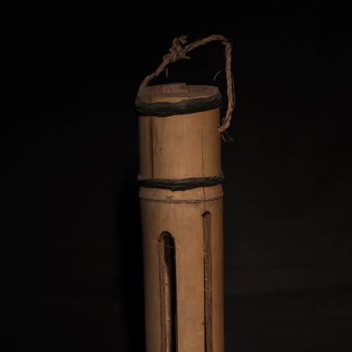 | คำอธิบาย : กะโหล้กสองปาก ทำจากกระบอกไม้ไผ่ขนาดใหญ่ เจาะรูสองรูเป็นทางยาว บริเวณกลางกระบอก รูที่เจาะไว้เพื่อให้เสียงออกมีขนาดไม่เท่ากัน เจาะรูเพื่อร้อยสายเชือกที่ใช้ห้อย กะโหล้กหรือเกราะ เป็นเครื่องมือในการบอกสัญญาณให้ชาวบ้านได้ทราบเพื่อการทำอย่างใดอย่างหนึ่ง หากตีเป็นจังหวะสั้นและรัวตอนสุดท้าย หมายถึงเรียกประชุม หากตีเร่งเร้าถี่ หมายถึงเกิดเหตุเภทภัยต้องรับช่วยเหลือ |