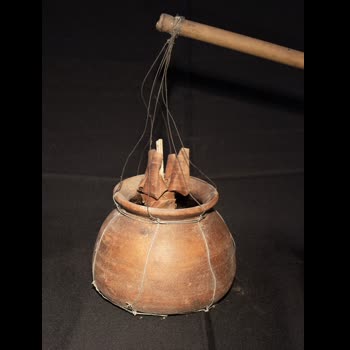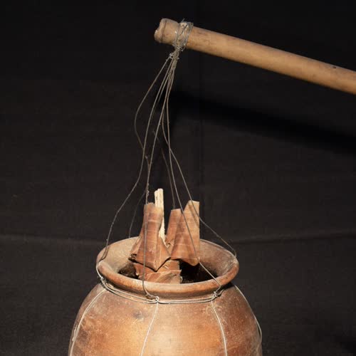 | คำอธิบาย : หม้อไฟ เป็นหม้อดินเผาที่ยึดโยงกับไม้โดยใช้ลวด หม้อดินเผ่าลักษณะคล้ายหม้อต่อม ใช้ลวดสานรัดหม้อไว้ แล้วทำสายยึดโยงไปที่ลำไม้ไผ่ยาว ใช้ในพิธีศพแม่ของพ่อครูนิคม พรหมมาเทพย์ ใช้ใส่ถ่านไฟเพื่อนำหน้าเวลานำศพไปสุสาน |