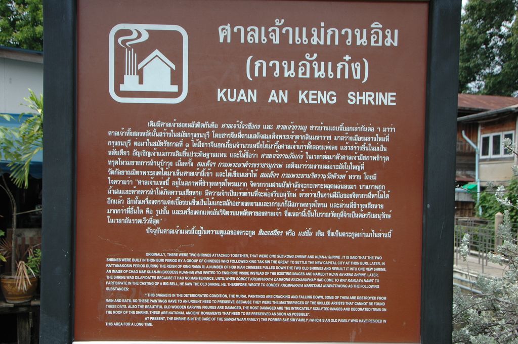 | คำอธิบาย : ศาลเจ้าเกียนอันเกง หรือ ศาลเจ้าแม่กวนอิม เป็นศาลเจ้าจีนเก่าแก่ของชุมชนกุฎีจีน ตั้งอยู่บริเวณริมฝั่งแม่น้ำเจ้าพระยาระหว่างวัดกัลยาณมิตรวรมหาวิหารและวัดซางตาครู้ส ศาลเจ้าได้สร้างขึ้นในปีใดไม่เป็นที่ทราบแน่ชัด แต่กล่าวกันว่าชาวจีนฮกเกี้ยนที่ตามเสด็จพระเจ้าตากสินมหาราชเป็นผู้สร้างขึ้น |