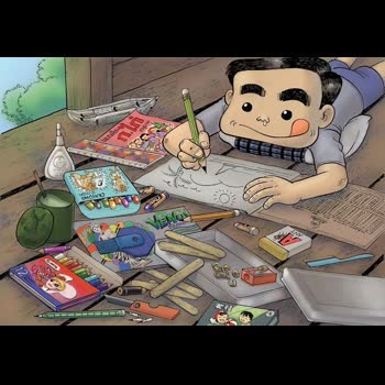 | คำอธิบาย : ผมสารภาพเลยว่าเป็นคนที่ไม่ได้วาดรูปเก่งกาจอะไร แค่สนุกและมีความสุขกับการวาดรูปที่อยู่ในหัวออกมา\\\\\\\ที่บอกในเพจว่าเป็น ‘ศิลปิน’ ก็เพราะมันไม่มีข้ออื่นให้ติ๊กตอนสร้างเพจใหม่ๆ เพราะไม่รู้เรื่องอะไรเลยตอนทำเพจ\\\\\\\ขณะที่ผมกำลังทำงานอีกชิ้นอยู่ ผมก็นึกถึงตอนเด็กๆที่เราวาดรูปอย่างมีความสุขมากๆ ซึ่งก็คงเหมือนท่านผู้อ่านตอนเด็กๆแหละครับ ที่เวลาคุณๆวาดภาพเล่นก็คงไม่หนี รูปทะเล มีภูเขาสามสี่ยอด มีเรือใบ มีต้นมะพร้าวใบแหลมๆ และดวงอาทิตย์กลมโต รัศมีเป็นแฉกๆ\\\\\\\ไม่รู้ว่าภาพพวกนี้ฝังลึกติดอยู่ในหัวตั้งแต่เมื่อไหร่ ทั้งที่ไม่เคยไปทั้งทะเล และภูเขา แต่เมื่อเริ่มจับดินสอวาดรูป ภาพนี้ก็จะปรากฏขึ้นในหัวแบบอัตโนมัติทันที\\\\\\\เมื่อนึกถึงตอนนั้น เหล่าเครื่องเขียนในสมัยนั้นก็จะวูบเข้ามาในความคิดให้คิดถึงอีกด้วยเช่นกัน\\\\\\\ผมไม่ได้มีมากมายเหมือนที่วาดในภาพหรอกนะครับ มีไปทีละอย่าง หายไปทีก็ซื้อใหม่ที คุณๆก็รู้ของพวกนี้หายได้ง่ายมากอย่างกับล่องหน เมื่ออยู่ในมือเด็กๆอย่างเรา\\\\\\\ท่านผู้อ่านก็คงเคยได้ผ่านมือเครื่องเขียนเหล่านี้มาบ้างเป็นบางชิ้นนะฮะ\\\\\\\เราเริ่มทวนความจำกันที่ ยางลบ เอบีซี มันก็เป็นยางลบก้อนบางๆนั่นแหละ แต่เหนียวหนึบนักแล นอกจากมีตัวอักษรภาษาอังกฤษตัวใหญ่ไว้ให้ท่องเล่นแล้ว ตรงหัวมันจะเป็นยางสีๆ ทั้งแดง เขียว เหลือง ผมก็ไม่รู้ว่าส่วนนี้มีไว้ทำไม นอกจากเอาไว้ให้แทะเล่นจนส่วนนี้หลุดออกมาจากตัวยางลบนั่นแหละ\\\\\\\ต่อจากนั้นก็เป็นสีเทียนจากจีนแดง ห่อมักพิมพ์เป็นรูปสไตล์ ศิลปะสังคมนิยม แต่เป็นเรื่องเกี่ยวกับเด็ก เช่น งิ้ว หรือกีฬาต่างๆ เหล่านี้มักเป็นกล่องกระดาษแข็ง ส่วนที่ผมจำได้แม่นคือห่อที่เป็นกระดาษอ่อนๆพับๆติดกาวสีฟ้าทึมๆ พิมพ์เป็นรูปการ์ตูนหน้ากากเสือ การ์ตูนดังสมัยนั้น สีนี้จะเป็นฟิลลิ่งขี้ผึ้งมากๆ อยู่ในกระเป๋าตากแดดนิดหน่อย ก็อ่อนยวบละลายเหมือนเทียนได้ ใช้ไม่หมดเพราะมักจะหายหมดเสียก่อน\\\\\\\ไม้บรรทัดสามมิติ มันเป็นไม้พลาสติกที่มีรูปสวยๆ จำได้ว่าเป็นรูปแมลง ผีเสื้อ ด้วง เวลาขยับไม้ รูปก็จะขยับวูบวาบตาม มีอยู่อันเดียวจนหักไปแล้วไม่ได้มีใหม่อีกเลย\\\\\\\ยางลบปากกา ไอ้ก้อนแบนๆรูปหกเหลี่ยม หุ้มที่จับพลาสติกมีแปลงปัดตรงปลายนั่นแหละฮะ บอกได้เลยว่ายางลบนี้มันเป็นอมตะ เพราะใช้เท่าไหร่ก็ไม่หมดซะที เวลาใช้ก็แตะน้ำลายแล้วก็ลบตรงที่เขียนผิด ลบจนกระดาษสมุดโหว่เป็นรูทั้งเล่ม ยางลบปากกานี่ก็แค่สึกกร่อนไปเล็กน้อย จะหมดก็เพราะเราเอามาล่อนเล่นใส่หัวกันจ